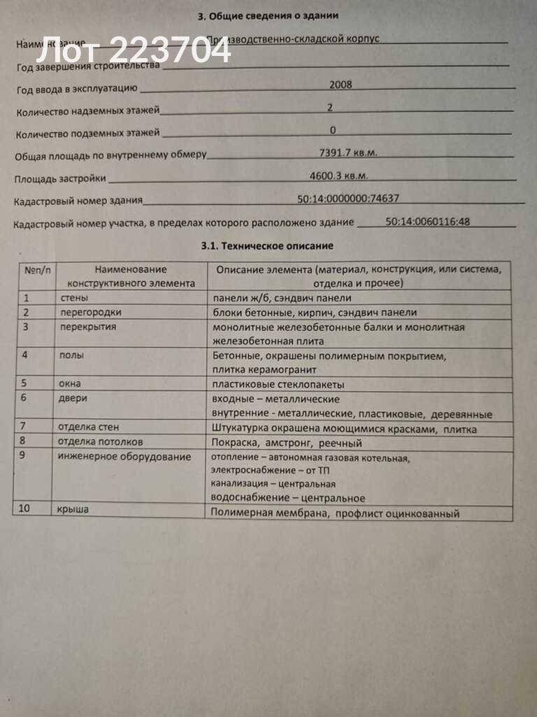 Лот № 223704 В аренду предлагается производственно-складской корпус на пищевом предприятии в Лосино-Петровском. Площадь здания — 7500 м, возможно арендовать меньшую часть. Первый этаж (4292 м?) с высотой потолков 5 м, наливными полами (нагрузка до 10 тонн/м?), зонами погрузки и разгрузки, пятью воротами. Второй этаж (3100 м?) с высотой потолков 4, 5 м, наливными полами, двумя лифтами. Подведены газ, вода, канализация, вентиляция, дымоудаление. Удобное расположение: 26 минут до метро Железнодорожная. В окрестностях магазины, кафе и другие объекты. Цена: 1050 руб. /м?. Арендные каникулы и ставка обсуждаются.